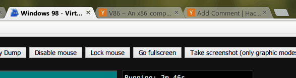 v86 에뮬레이터로 브라우저에서 Windows 98을 실행하는 모습